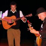 The musician, a West Dorset man who has a stellar reputation on the local and UK music scene, began the evening on stage by himself. He came out slowly, without speaking, and launched straight into an instrumental number. Before long it wasn’t just the banjo going as Dave Allen certainly earned his nickname with some impressive tap moves. Throughout each song he kept in perfect time with the music, even giving some crowd-pleasing moves throughout, like playing his banjo behind his head or between his legs – again, he never missed a beat.